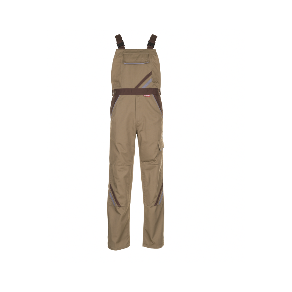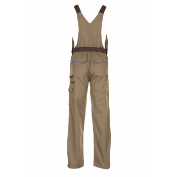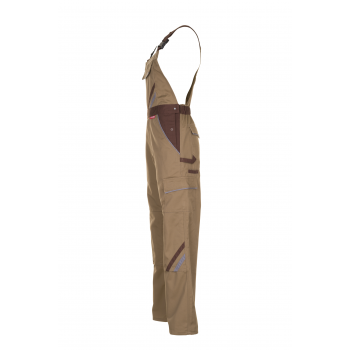 Ceinture élastiquée, réglage du tour de la taille avec bouton pression occulté, fermeture à glissière dans la braguette, pièce de dos relevée avec croisillon bretelle, bretelles avec bande élastique intégrée, boucle de sécurité sur les bretelles.