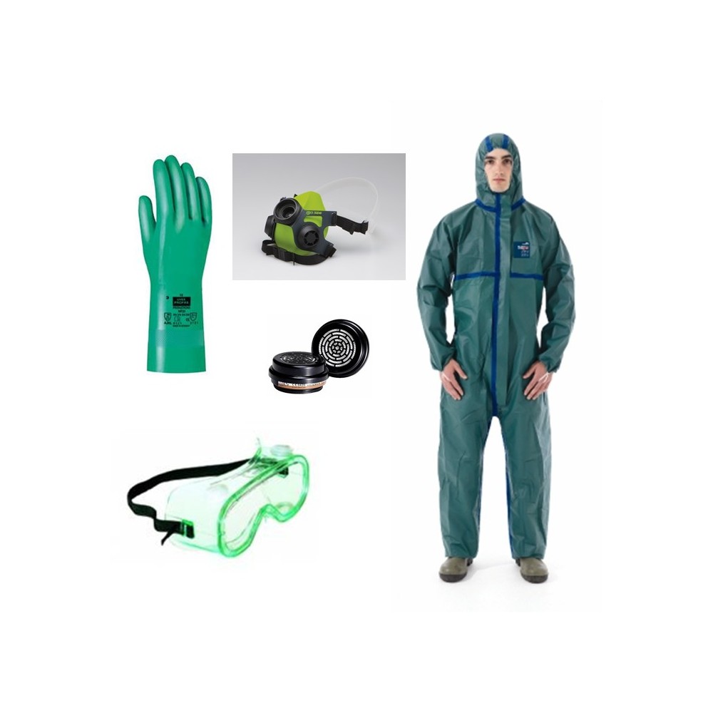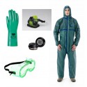 Avec demi masque BLS avec cartouches A2P3 interchangeables BLS, combinaison 4/5/6 Taille M, L ou XL, gants réutilisables 374-3 Taille 10 et lunette-masque.