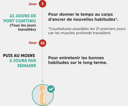 • Le gilet joue le rôle d'un rappel à l'ordre, grâce à son élastique, pour une colonne vertébrale alignée le plus fréquemment possible.