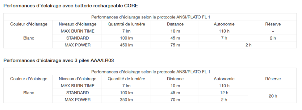 Spécifications | Poids : 105 grammes Puissance : 350 lumens (ANSI/PLATO FL 1) Type de faisceau : Large Étanche : IP67 Robustesse : résistance aux chocs IK07 (EN/IEC 62262) Résistance aux chutes : 2 mètres (ANSI/PLATO FL 1) Alimentation : 3 piles AAA/LR03 (incluses) ou piles rechargeables CORE (disponibles en accessoires) Compatibilité des piles : alcaline, lithium ou rechargeable NiMH Certification : CE, UKCA