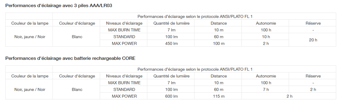 - Construction robuste : le feu est résistant aux chocs (IK07) et aux chutes (jusqu'à 2 mètres), - étanche à la poussière et à l'eau (IP67), - le faisceau large et homogène offre un champ de vision confortable pour les travaux de proximité, - Faisceau mixte pour un déplacement aisé, - Trois niveaux d'éclairage blanc : Max Burn Time (autonomie maximale), Standard (meilleur équilibre puissance/autonomie) et Max Power (puissance maximale).