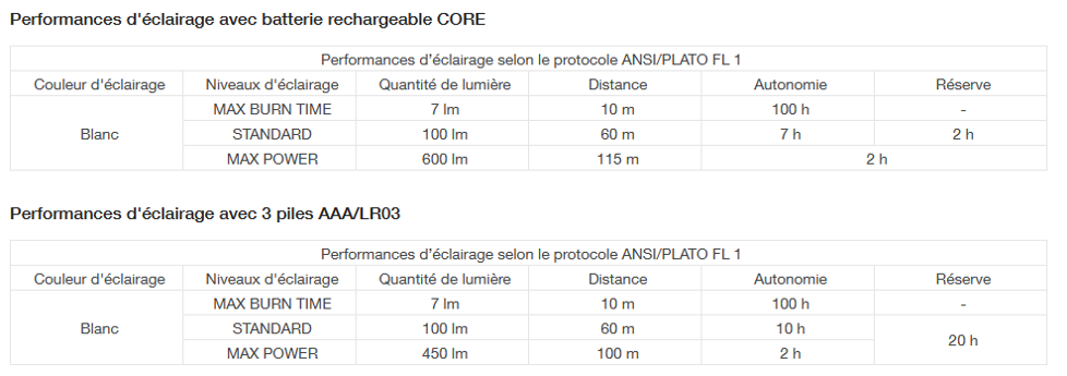 Spécifications | Sortie : 600 lumens (ANSI/PLATO FL 1) Type de faisceau : faisceau large, faisceau mixte Poids : 95 grammes Étanche : IP67 Résistance aux chocs : IK07 (EN/CEI 62262) Résistance aux chutes : 2 mètres (ANSI/PLATO FL 1) Alimentation : Batterie rechargeable CORE 1250 mAh / 3,6 V / 4,5 Wh (incluse) Compatibilité des piles : alcaline, lithium ou rechargeable NiMH Certification : CE, UKCA Temps de charge : 3 heures et 30 minutes