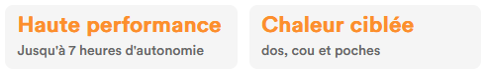 Chaleur | 4 zones de chauffage : 1 au niveau du dos, 1 pour le cou et 2 au niveau des poches avant Vous choisissez de chauffer les zones indépendamment l'une de l'autre - Faible intensité : 6 à 7 heures d'autonomie.