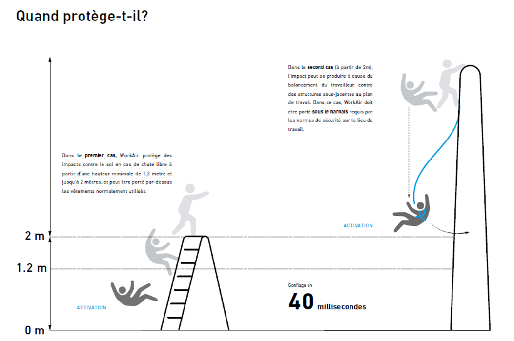 • WorkAir est le premier airbag de protection industrialisé et certifié comme équipement de protection individuelle pour les travaux en hauteur.