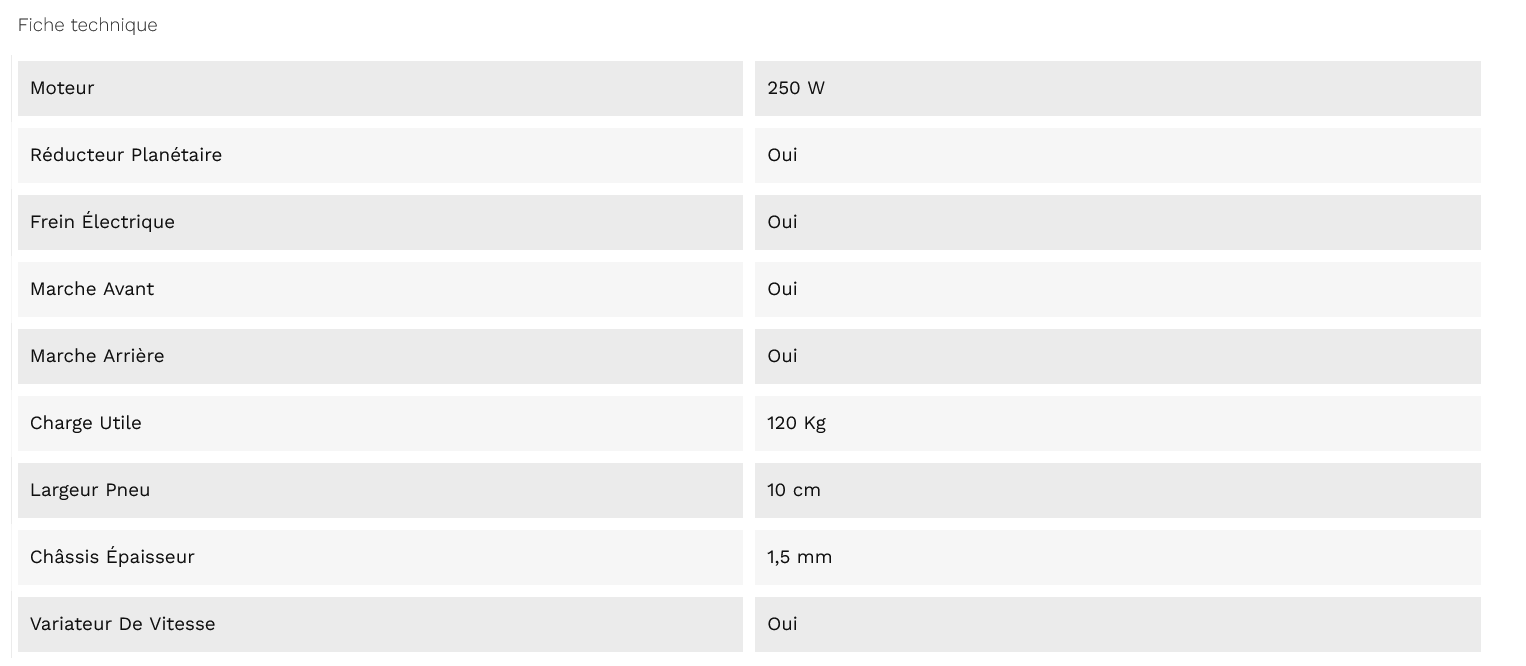• Vitesse : 3,5 km/h à pleine charge et 5 km/h à vide