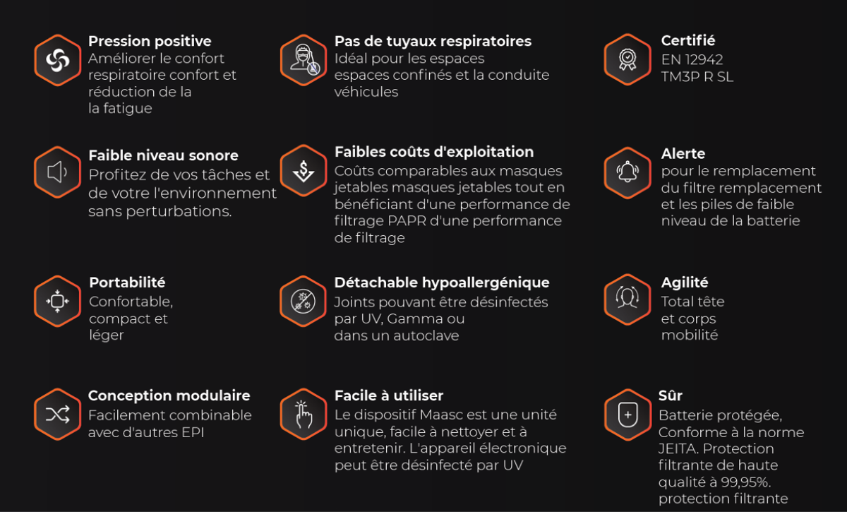 - Maasc, un dispositif de filtrage à ventilation assistée, est conforme à la norme EN 12942 TM3P R SL.