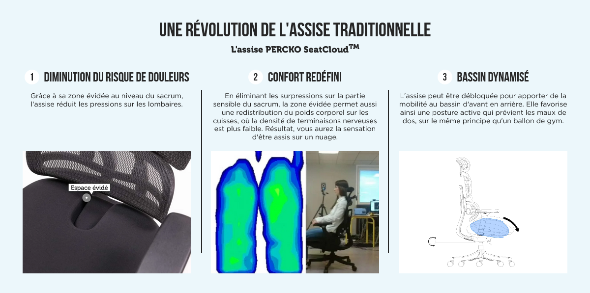 Avantages | - Répartition de votre poids de façon idéale notamment grâce à notre siège révolutionnaire avec une extrusion au niveau du sacrum afin éviter l’inconfort sur le bas de votre dos.
