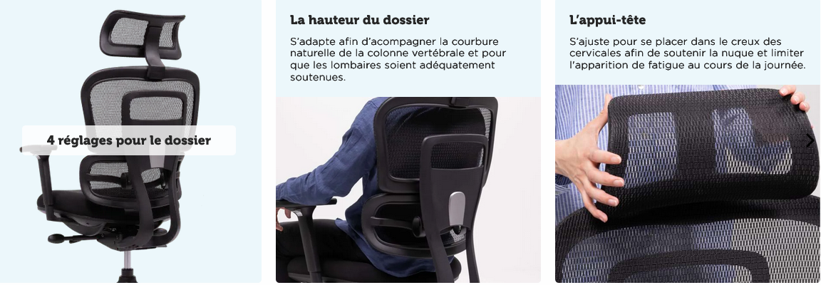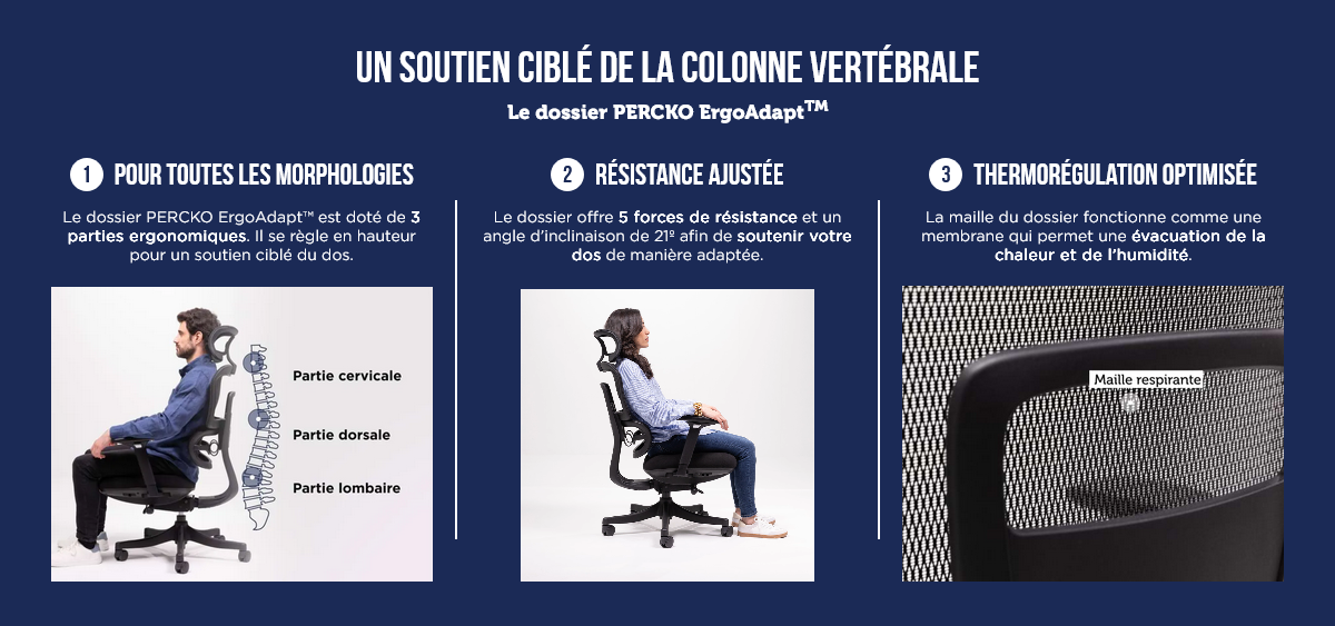 - Soutien votre dos de manière ciblée et sans surpression grâce à son dossier composé en trois sections pour vos lombaires, vos dorsales et vos cervicales