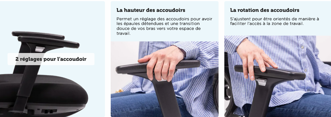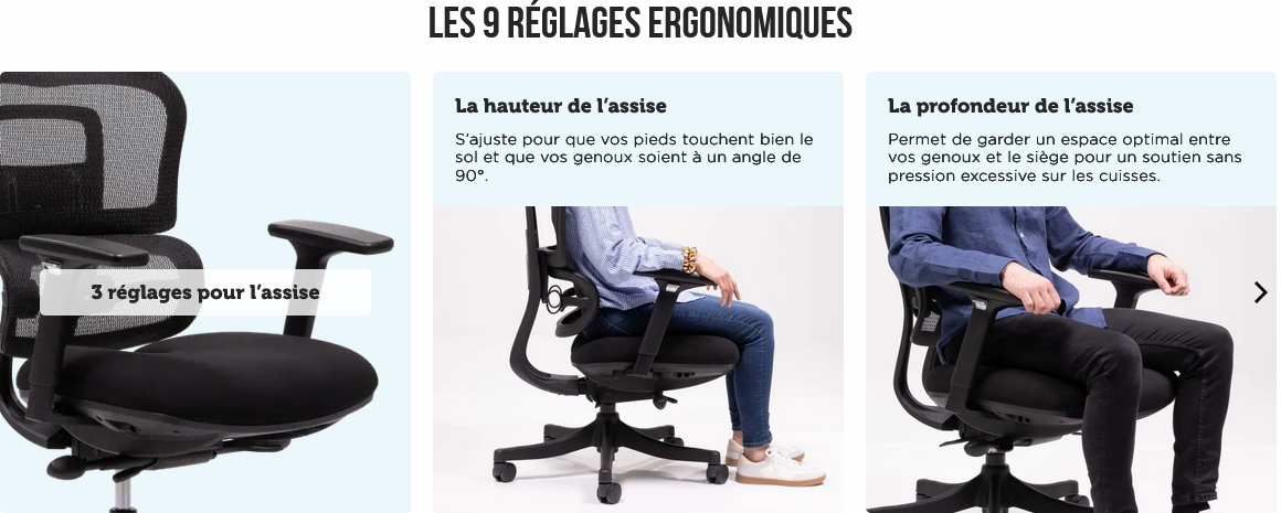 - Options possible de réglages de l’assise, des accoudoirs et du dossier pour une meilleure ergonomie a vos besoins.