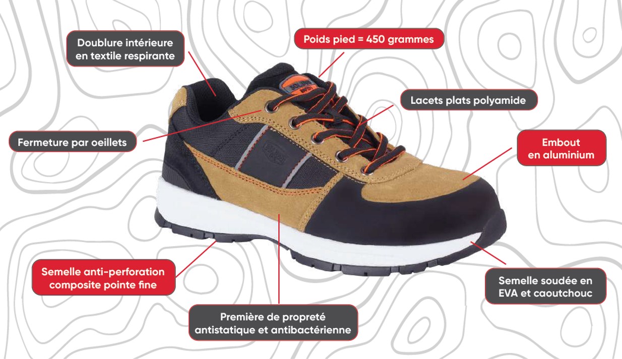 - Elles garantissent confort et sécurité grâce à leur embout aluminium, souplesse, grip, doublure ultra-respirante, matériaux renforcés, semelle anti-perforation haute ténacité, lacets en polyamide.